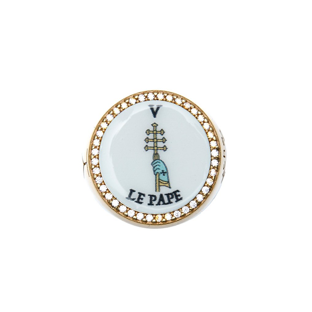 La collezione Round Tarot ha come leitmotiv il cerchio che racchiude un particolare scelto dalle immagini delle icone dai 22 Arcani Maggiori del Tarot di Marsiglia. Dettagli unici ed esclusivi, realizzati con cura ed abilità da mani esperte e sapienti. Materiali, lavorazioni, forme, tutto parla di estrema ricercatezza e raffinata ricerca stilistica. I gioielli Archetypum sono realizzati interamente a mano in Italia, impiegando la stessa manifattura dell’alta gioielleria. Ogni gioiello viene realizzato con la tecnica della fusione a cera persa. Il metallo utilizzato è una speciale lega di ottone che viene sottoposta a numerosi trattamenti che le donano robustezza e luminosità. Le pietre sono incastonate a mano, le immagini sono stampate direttamente sul metallo e poi protette da uno strato di smalto trasparente applicato a mano da maestri decoratori.Il gioiello viene poi finito con una doppia rodiatura e uno speciale trattamento di cataforesi proteggono il gioiello dall’ossidazione. Gli anelli sono dotati internamente di una particolare molla che permette la regolazione al dito, rendendolo più confortevole una volta indossato. Non sono utilizzati materiali nocivi alla salute, nel pieno rispetto delle norme europee e della nostra etica professionale (DLG 206 del 6/9/2005).